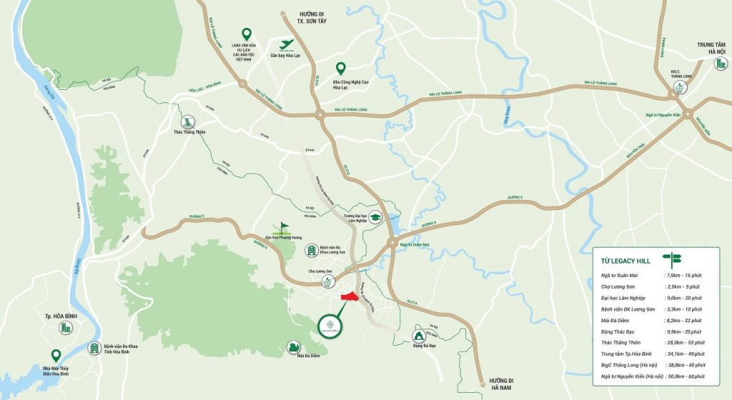 Dự án Legacy Hill Hòa Bình là tổ hợp khu đô thị dịch vụ 5 sao, nhà ở sinh thái nghỉ dưỡng, khu vui chơi giải trí. Tọa lạc tại vị trí đắc địa, chỉ cách Hà Nội 45 phút lái xe, thuộc huyện Lương Sơn, tỉnh Hòa Bình. Dự án Legacy Hill Lương Sơn bao gồm nhiều loại hình như: home-villas, home-tel, khu điều dưỡng chăm sóc sức khỏe, khu thư giãn ngắm cảnh với những khu vườn suốt 4 mùa hoa nở.